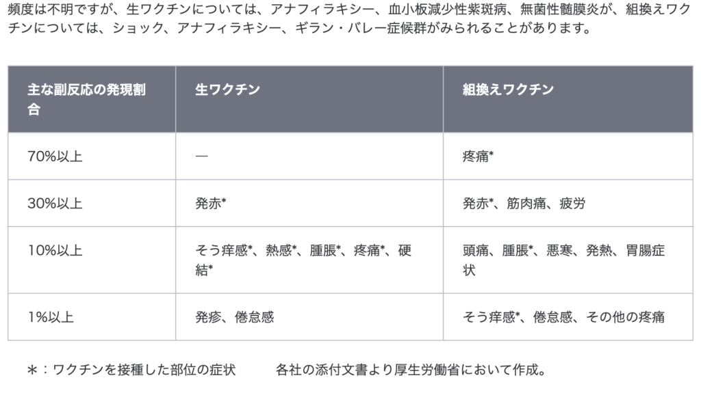 生ワクチンは副作用が少なめ、シングリックスは接種部位の腫れや倦怠感がやや出やすい傾向がありますが、どちらも重い副作用はまれで、数日でおさまることがほとんどです。